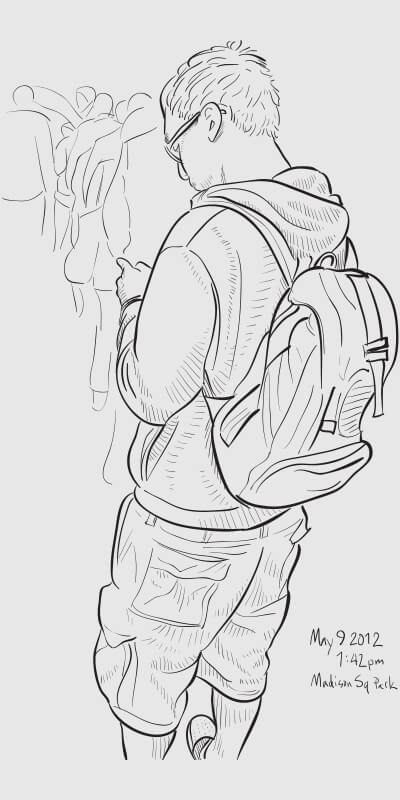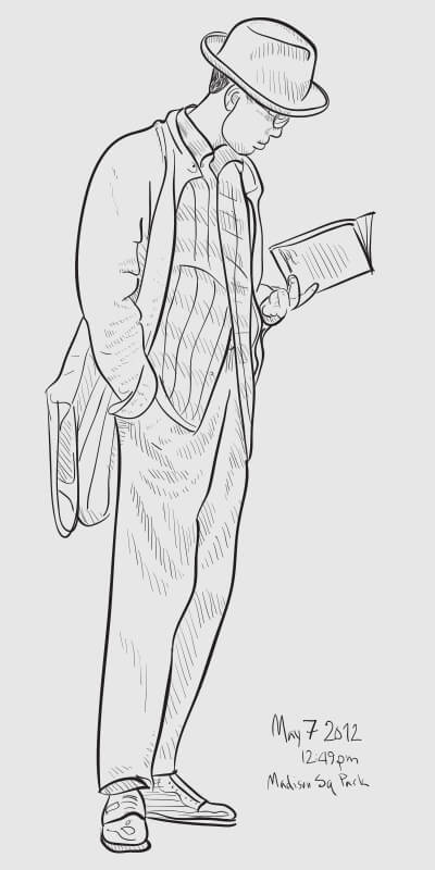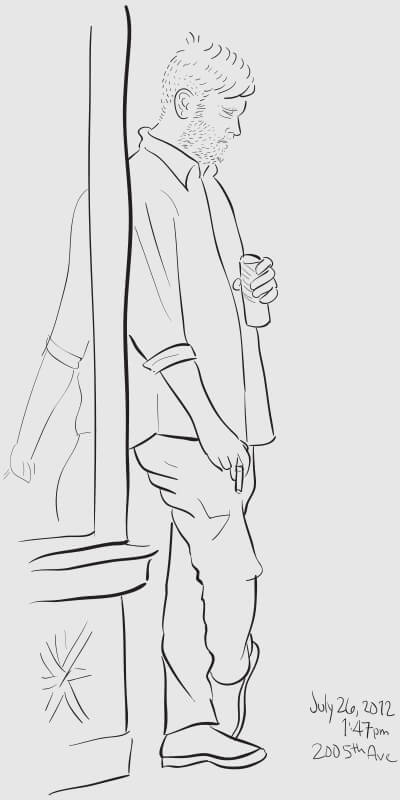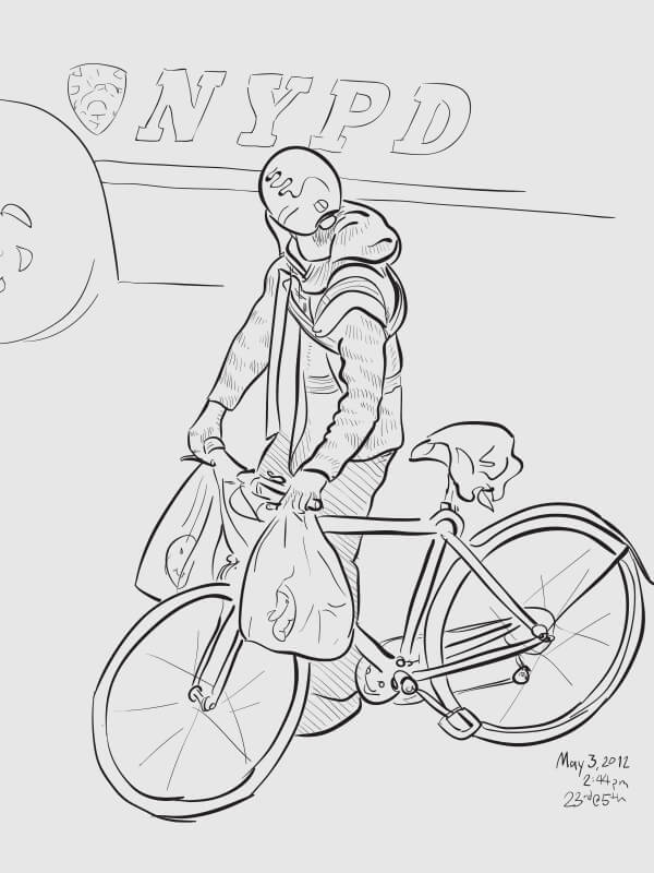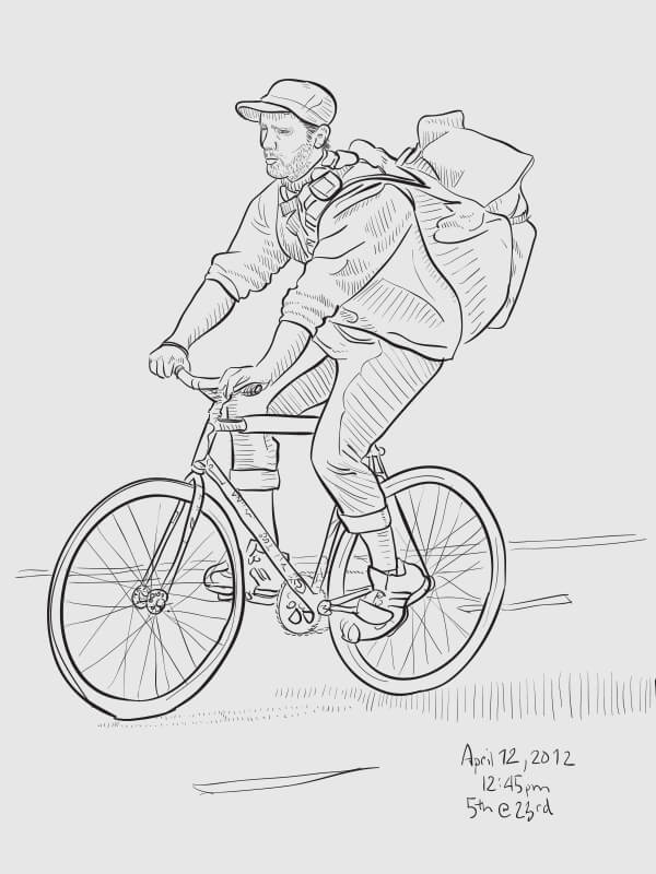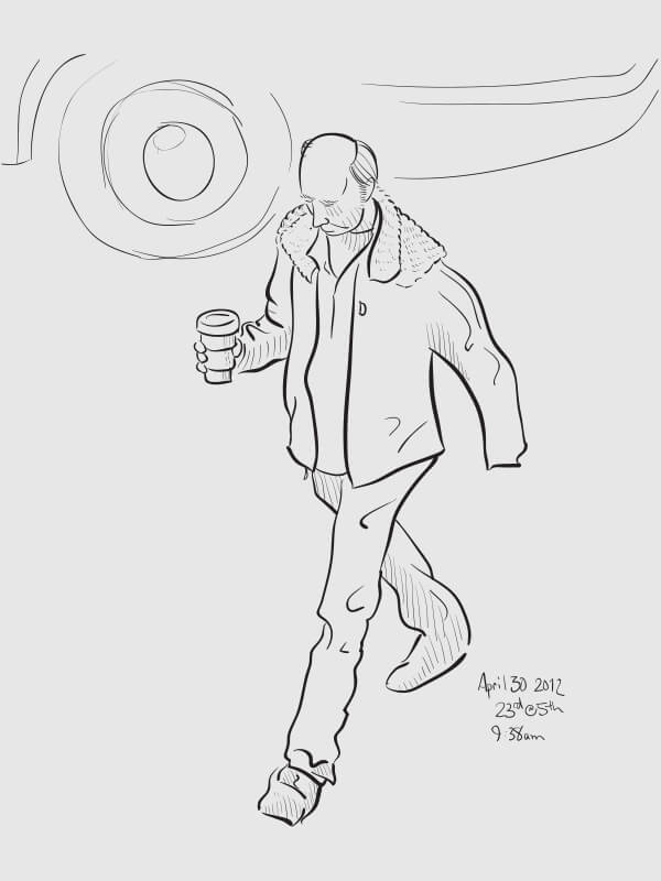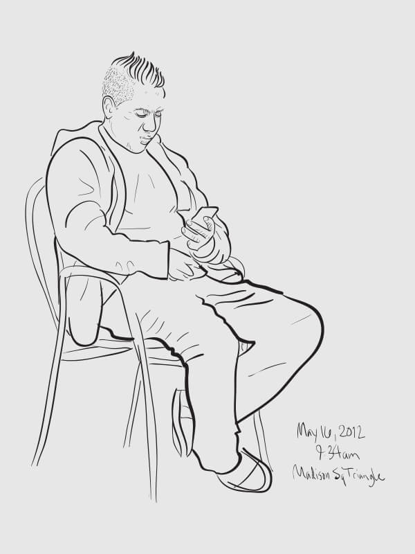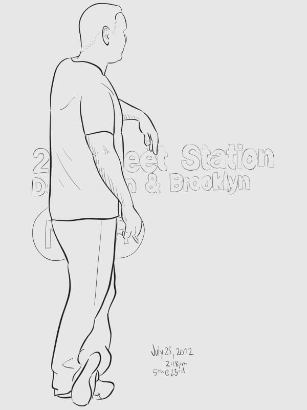A series of snapshot-based line drawings: one per day for one hundred days. Starting in late winter and continuing through the middle of summer, I would grab a snapshot each day from around the Flatiron neighborhood (on the street or out my 2nd story office window) and take 15–20 minutes to create a vector drawing in Illustrator. Shown are some of the more successful results.