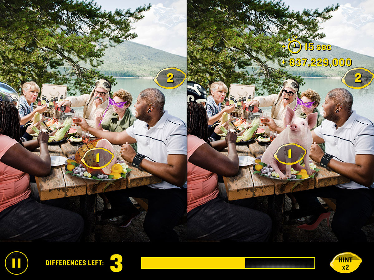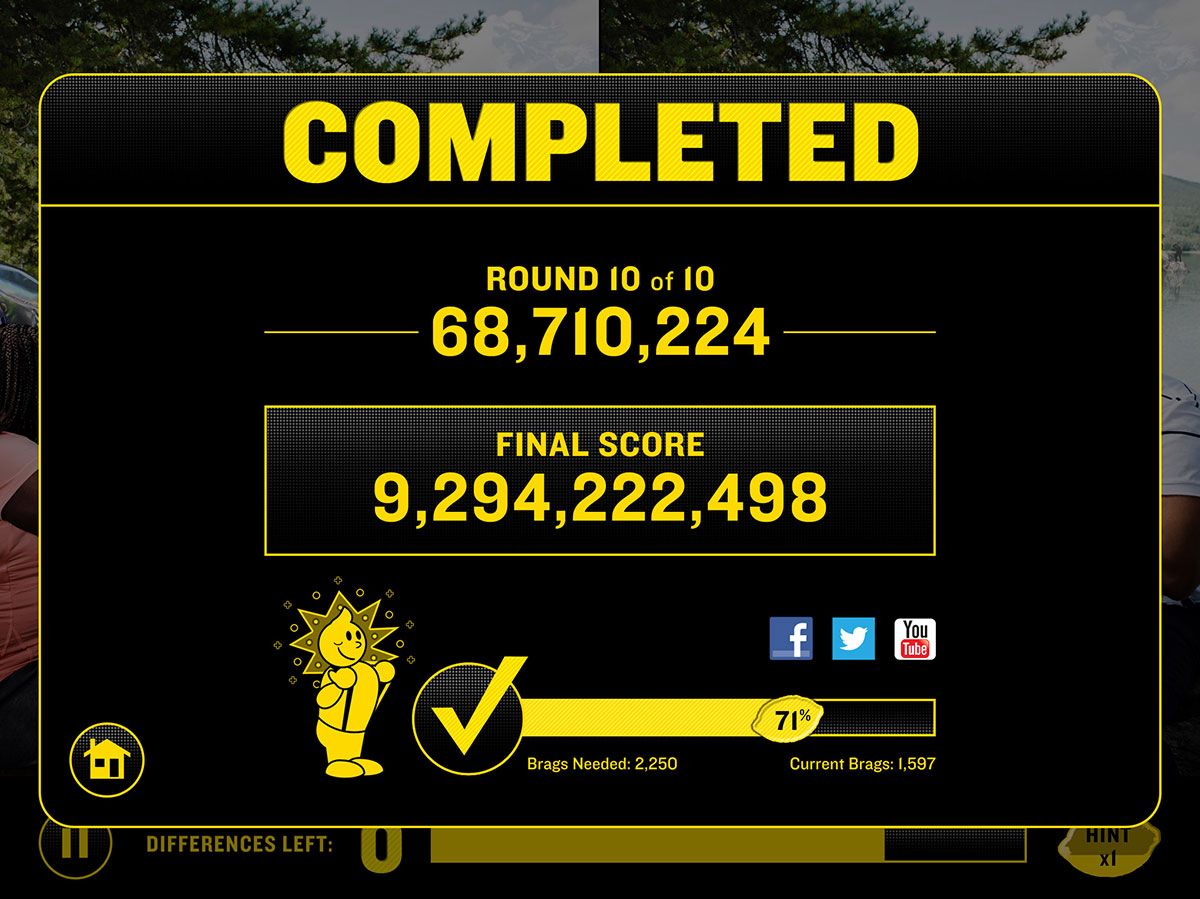 Game complete. Ridiculously high score totals is something I borrowed from stand-up pinball games. Social sharing counts as a "brag" — once enough bragging happens the app is updated with a new set of photos to hunt.