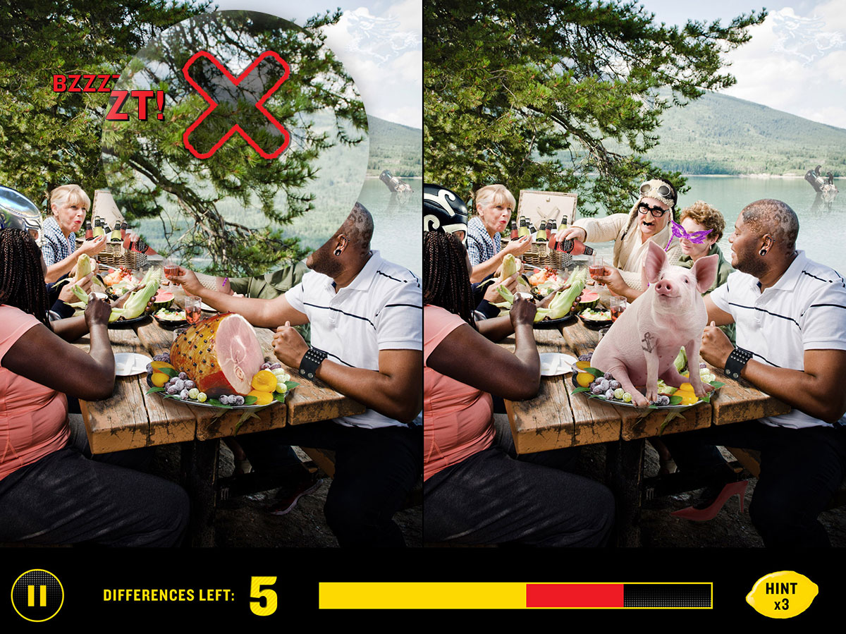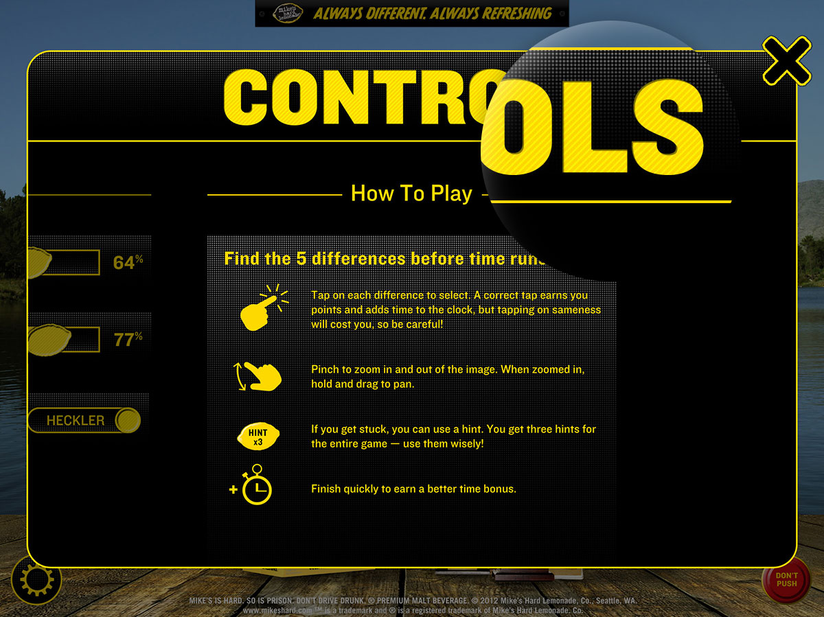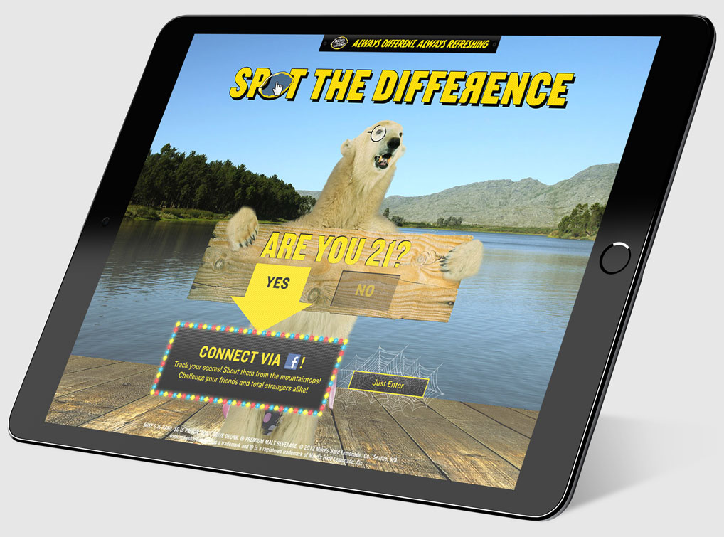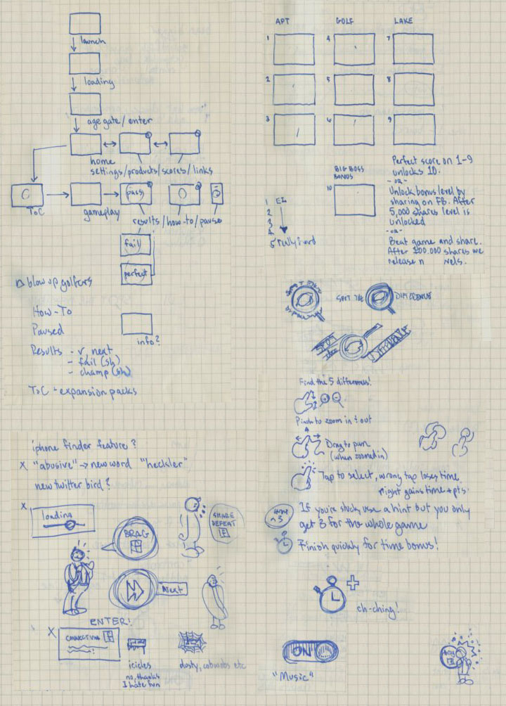 In support of the “Always Different, Always Refreshing” campaign I planned and designed a classic photo hunt game for the new-at-the-time Retina display iPad. To get started I did a quick survey of existing photo hunt games, noting the basic mechanics of the genre as well as the strengths and weaknesses of existing photo hunt apps. Afterward I sketched out a user flow and a set of tertiary game features.