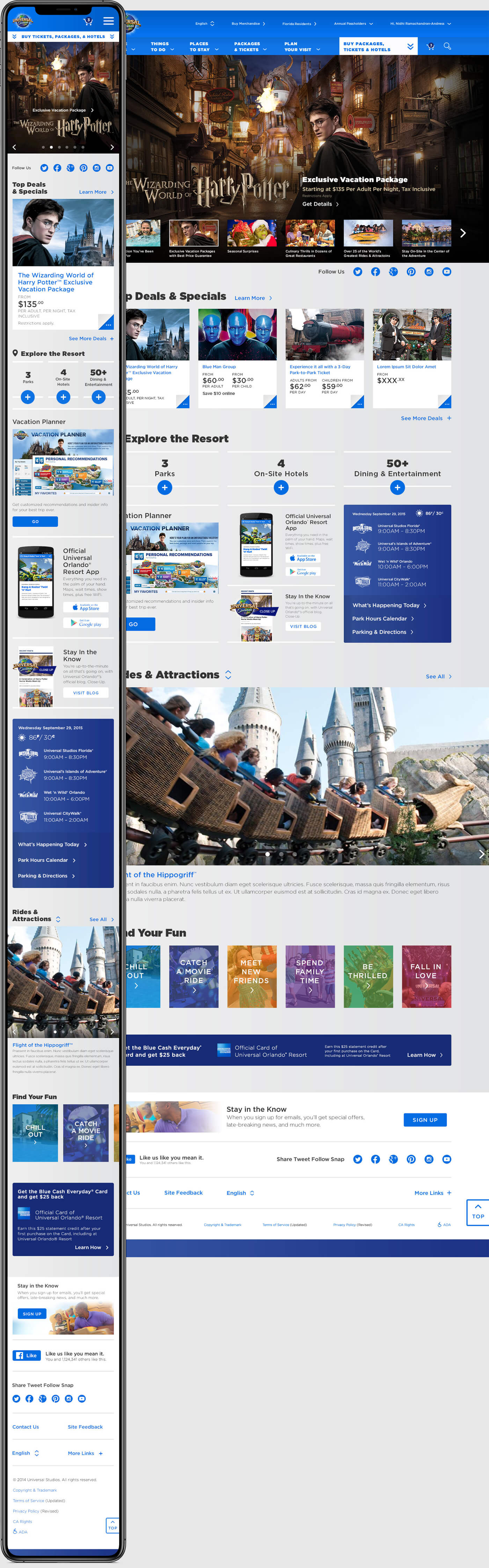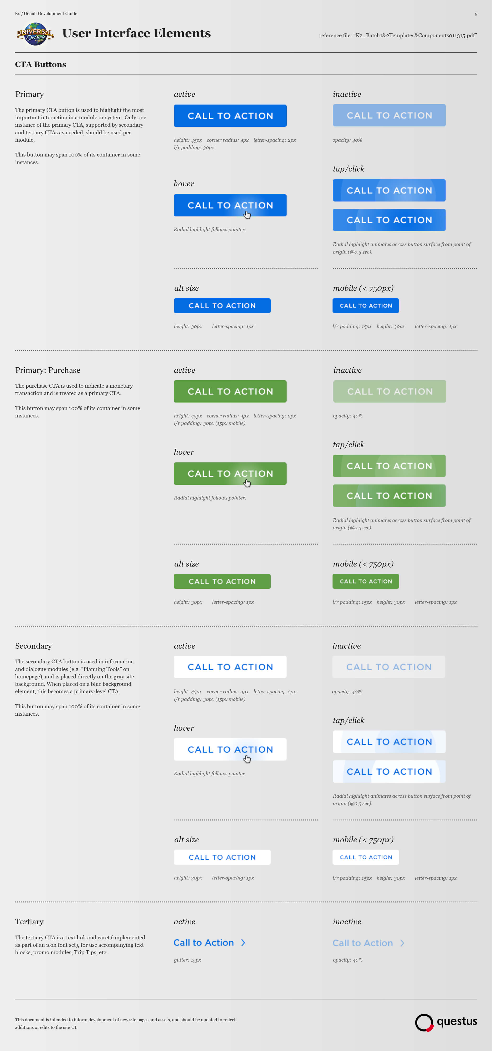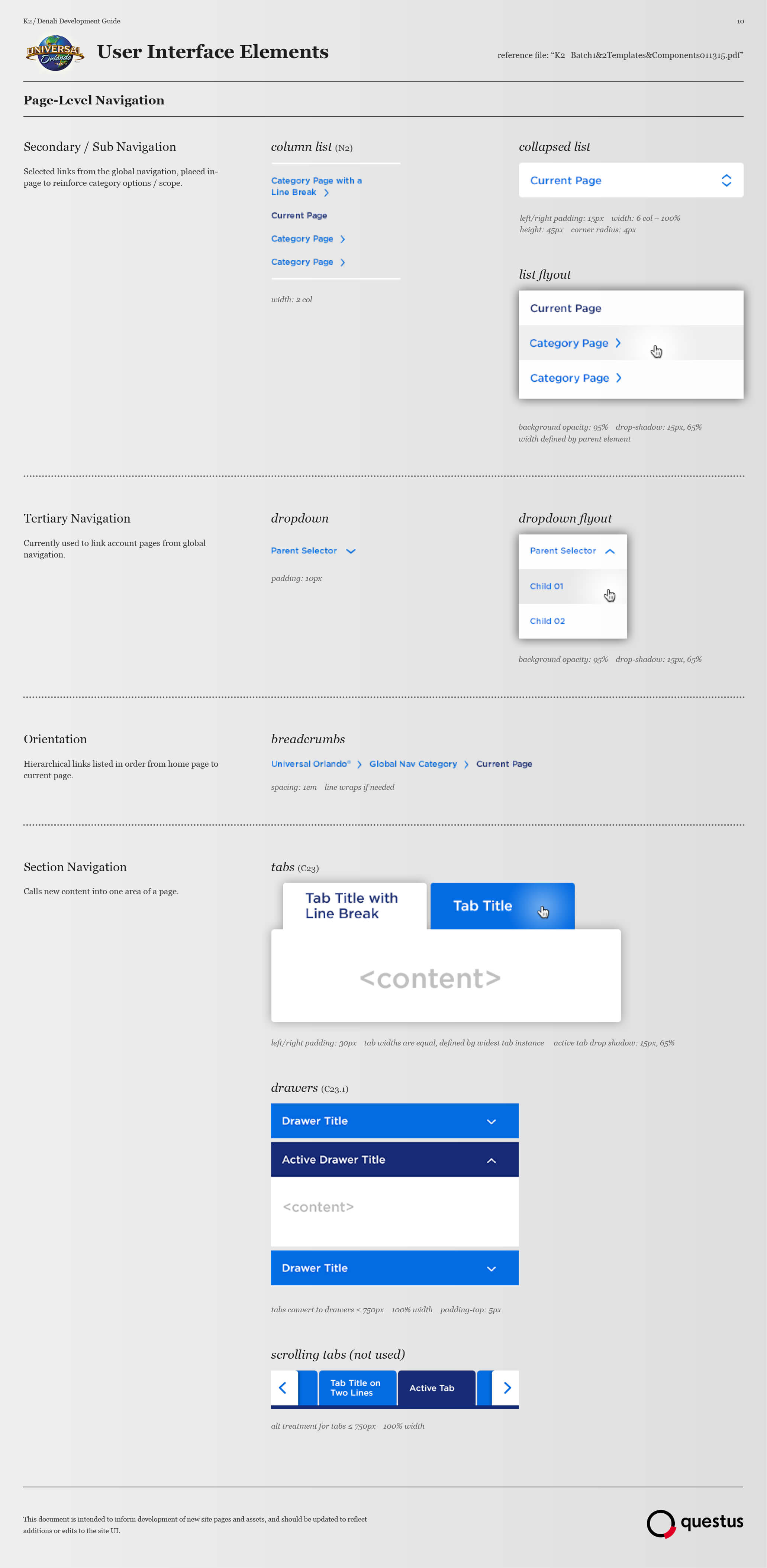 Documenting the design system for Universal Orlando's in-house design team and the site developers was a key deliverable. In addition to this guide, I produced a number of templates at various breakpoints for future use.