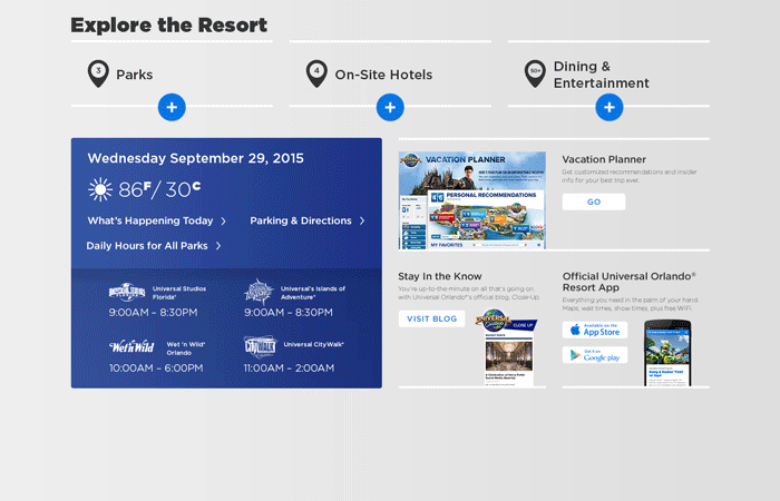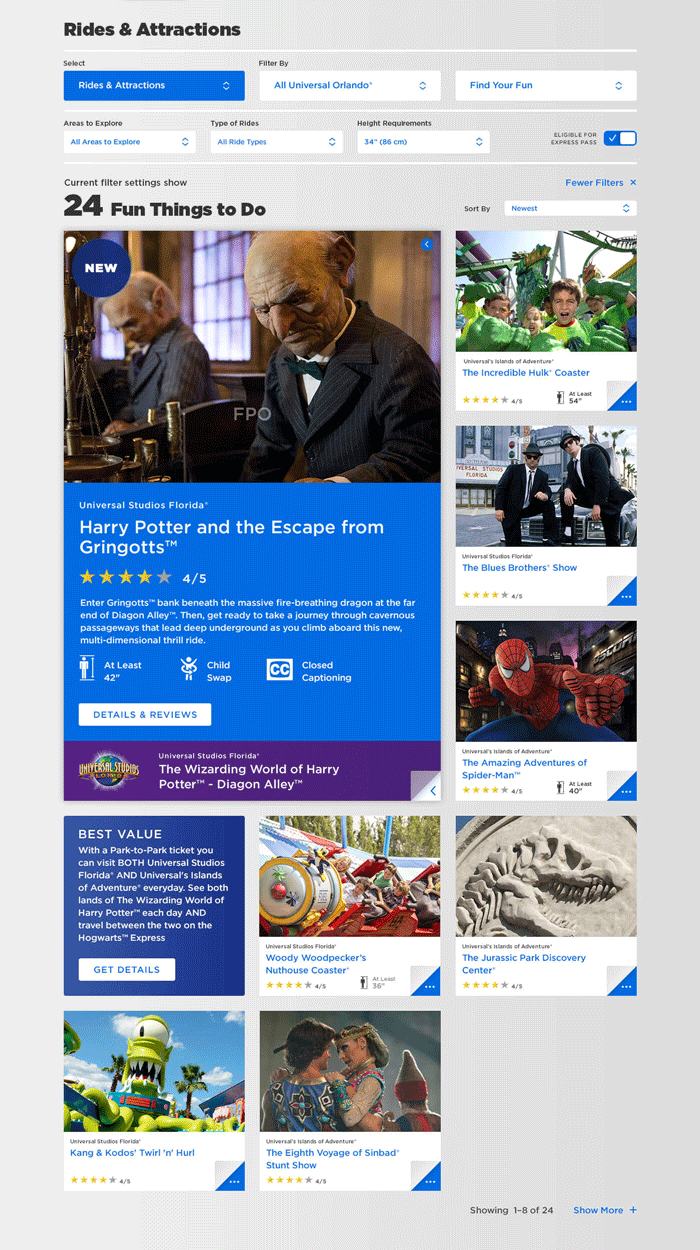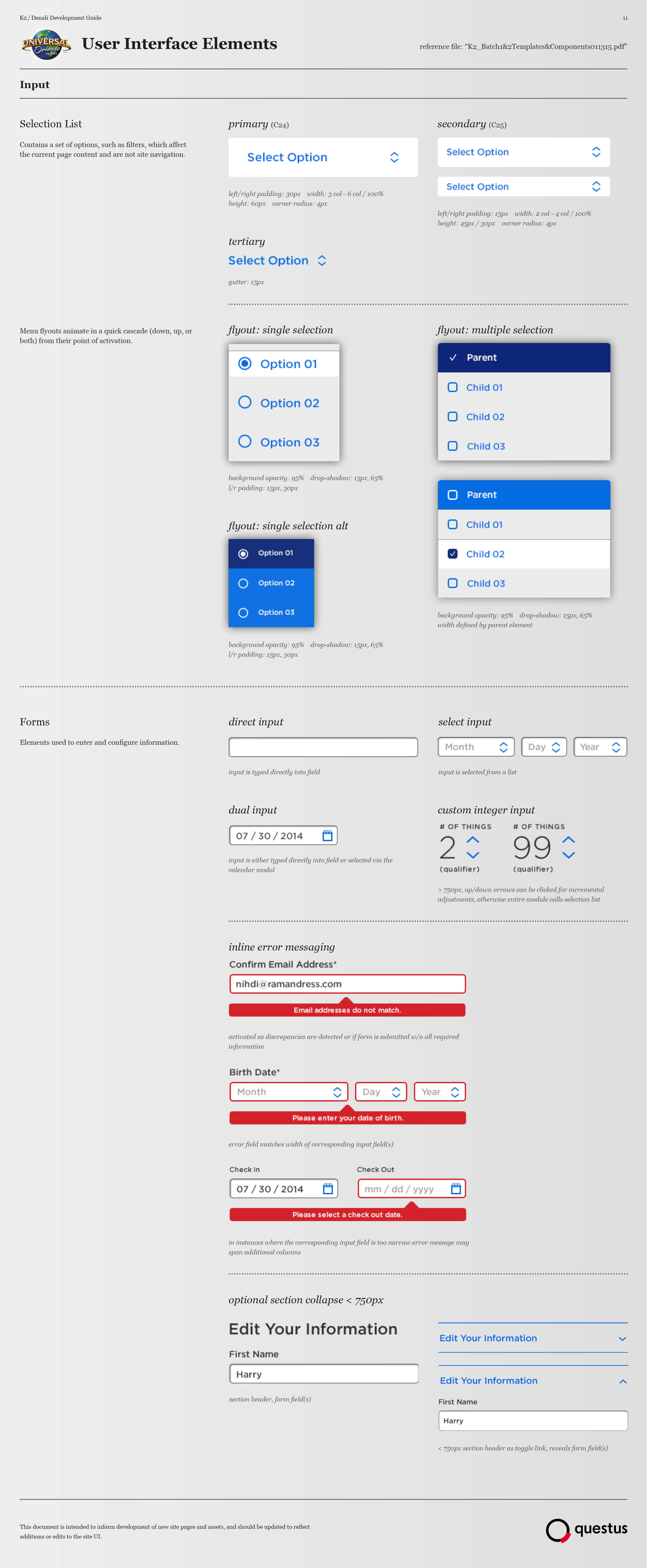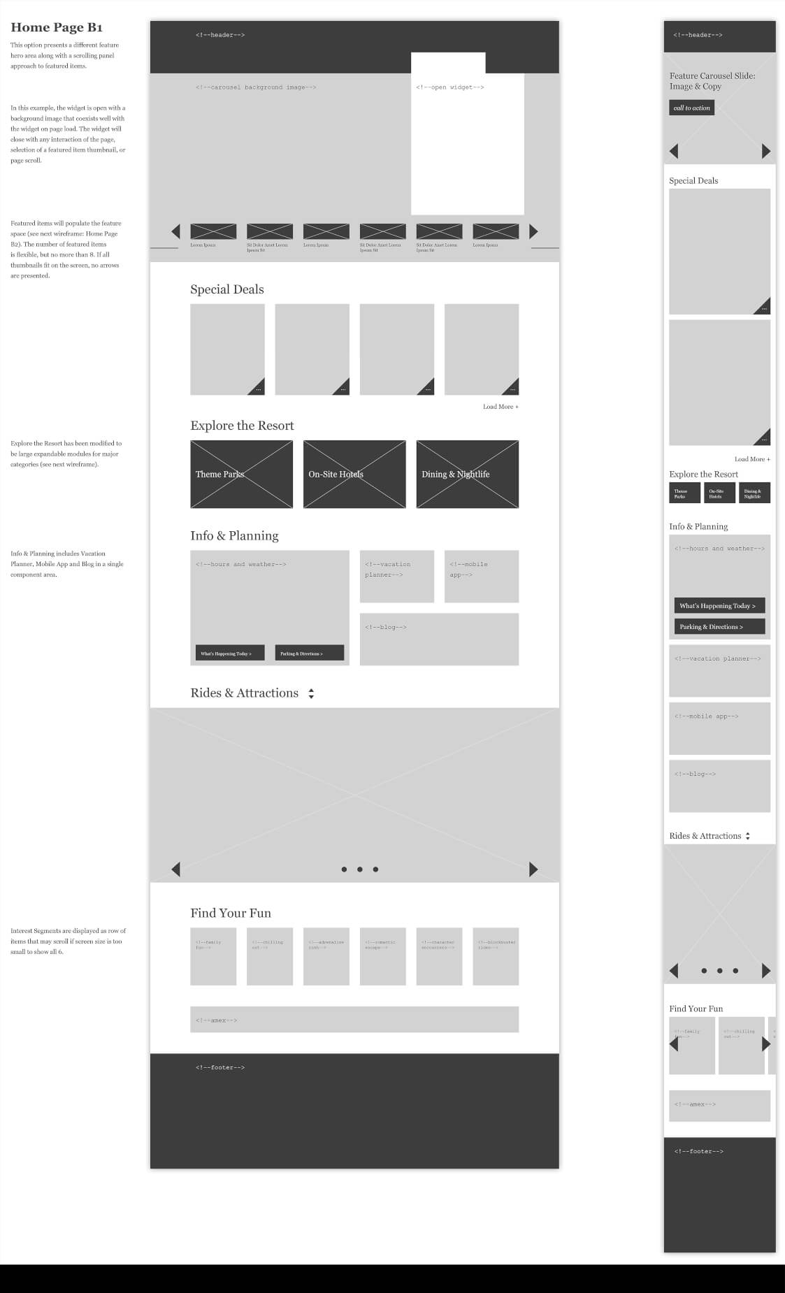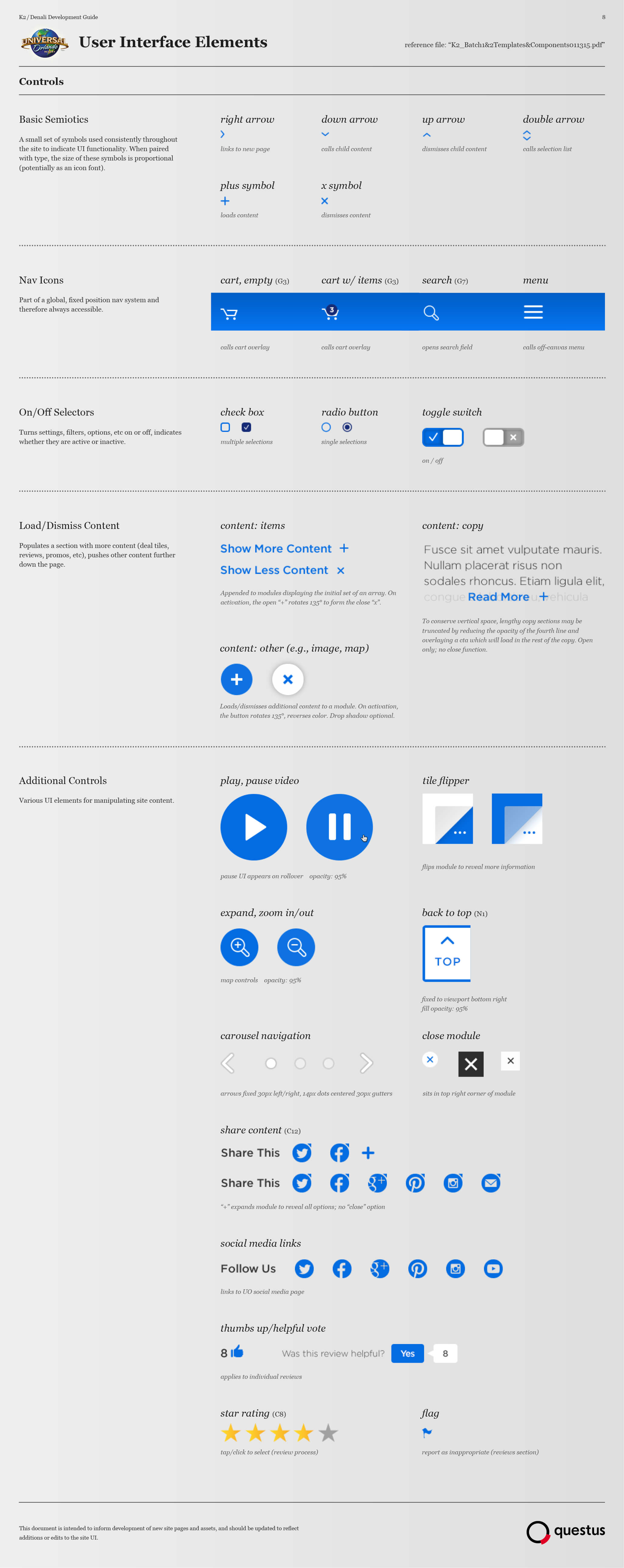 Documenting the design system for Universal Orlando's in-house design team and the site developers was a key deliverable. In addition to this guide, I produced a number of templates at various breakpoints for future use.